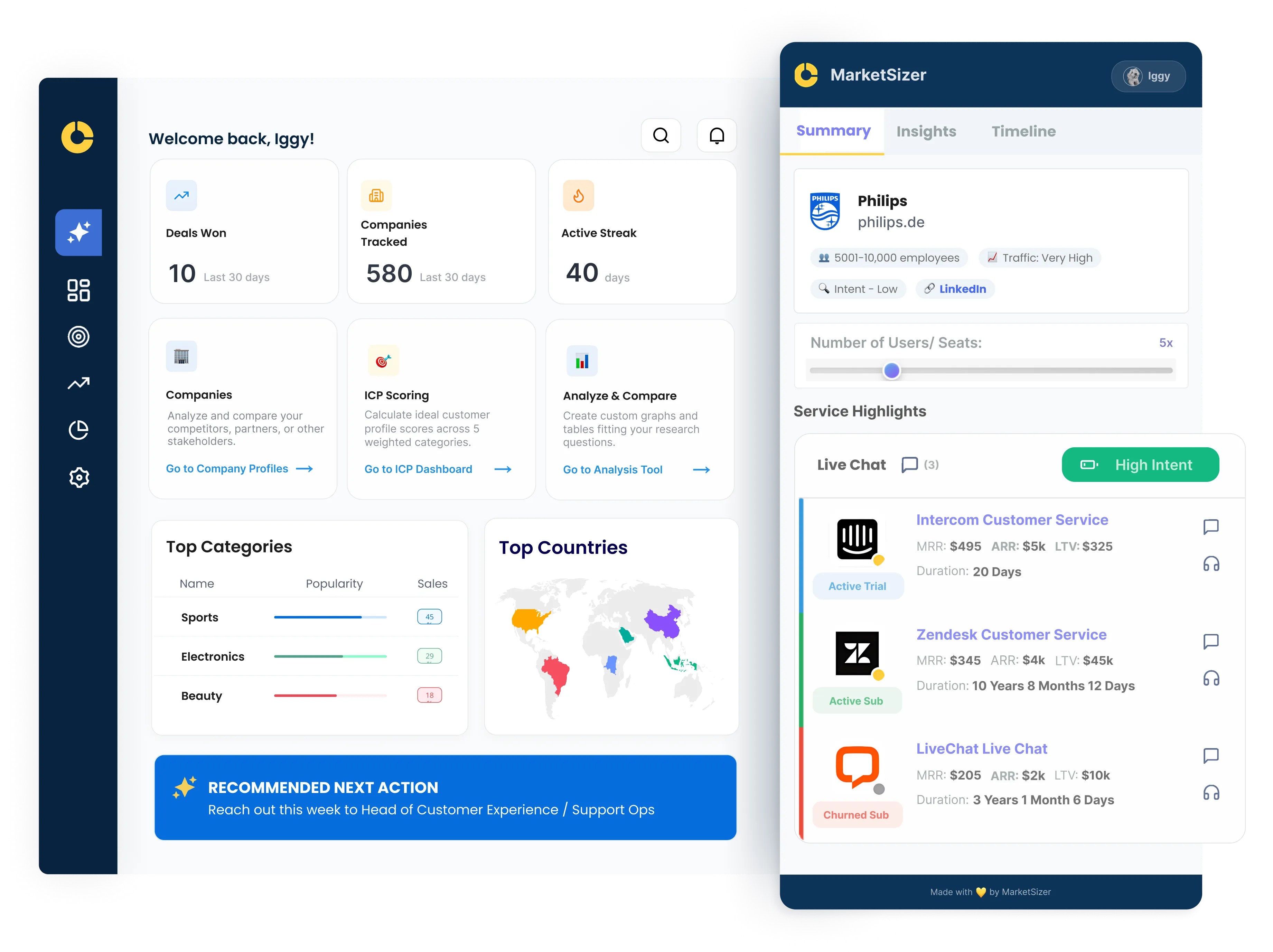 Most tools show who to target, MarketSizer tells you when to move. We detect real subscription signals (trials, renewals, churn), calculate win probability + ETC (30/60/90), and push a ready-to-send play into your CRM or browser. No guesswork.