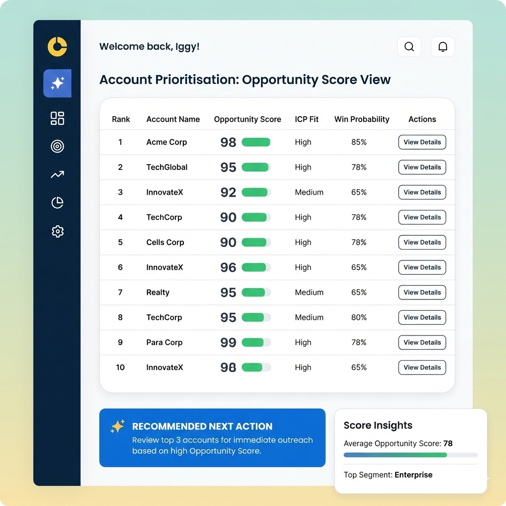 Rank accounts by ICP Match, Purchase Intent, and Win Predictor so you focus on in-market accounts you're likely to win.